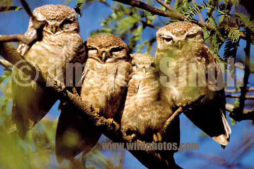 Spotted owlets huddling together for warmth in Keoladeo (Rajasthan)